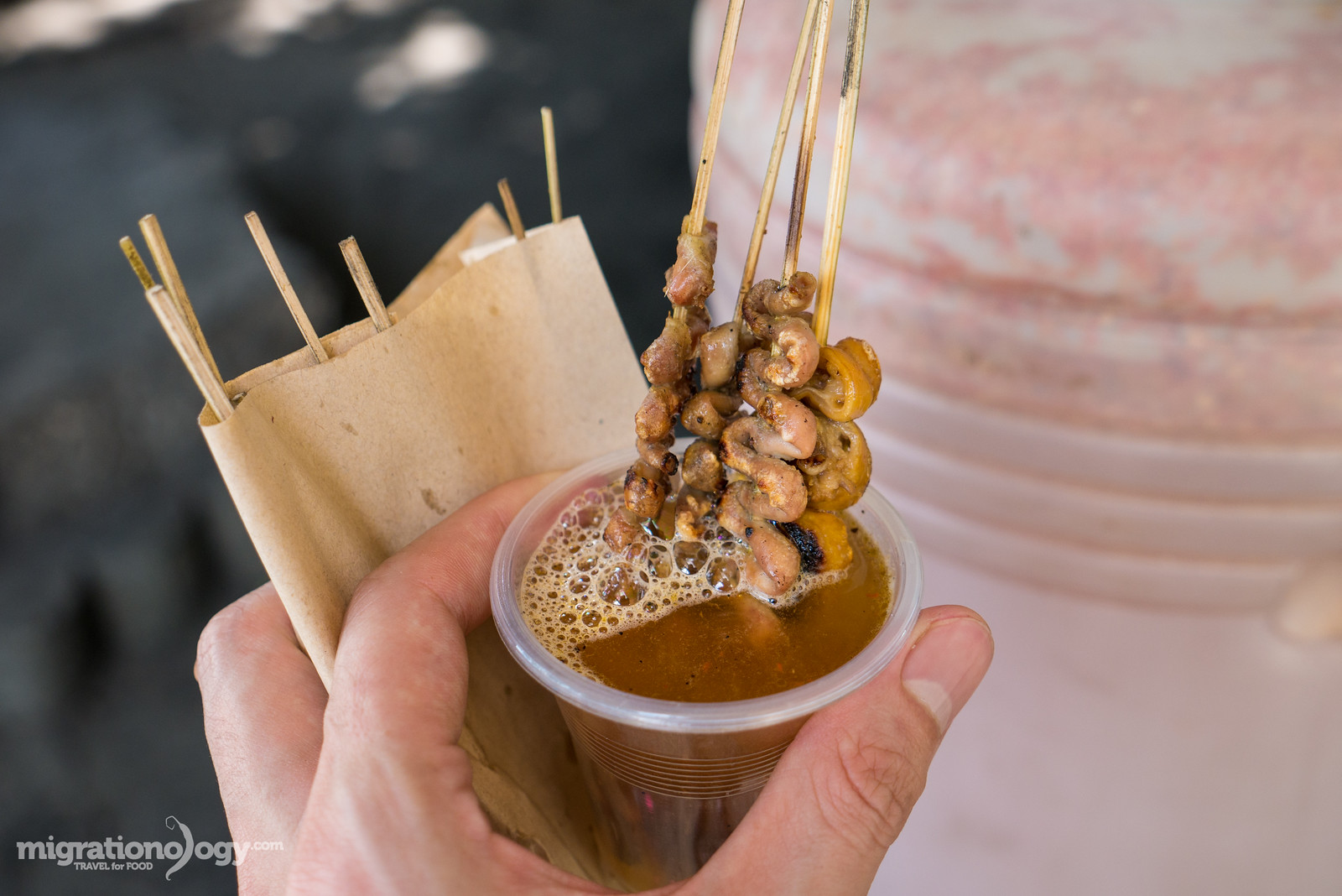 Starting in the middle to late afternoon, you’ll smell the charcoal being lit, and you’ll know it’s time for your afternoon snack. The intestines are coiled onto skewers, and grilled until charred and smoky. The pig intestines are a little chewier and stronger tasting, while chicken intestines are just like mini tube sausages.