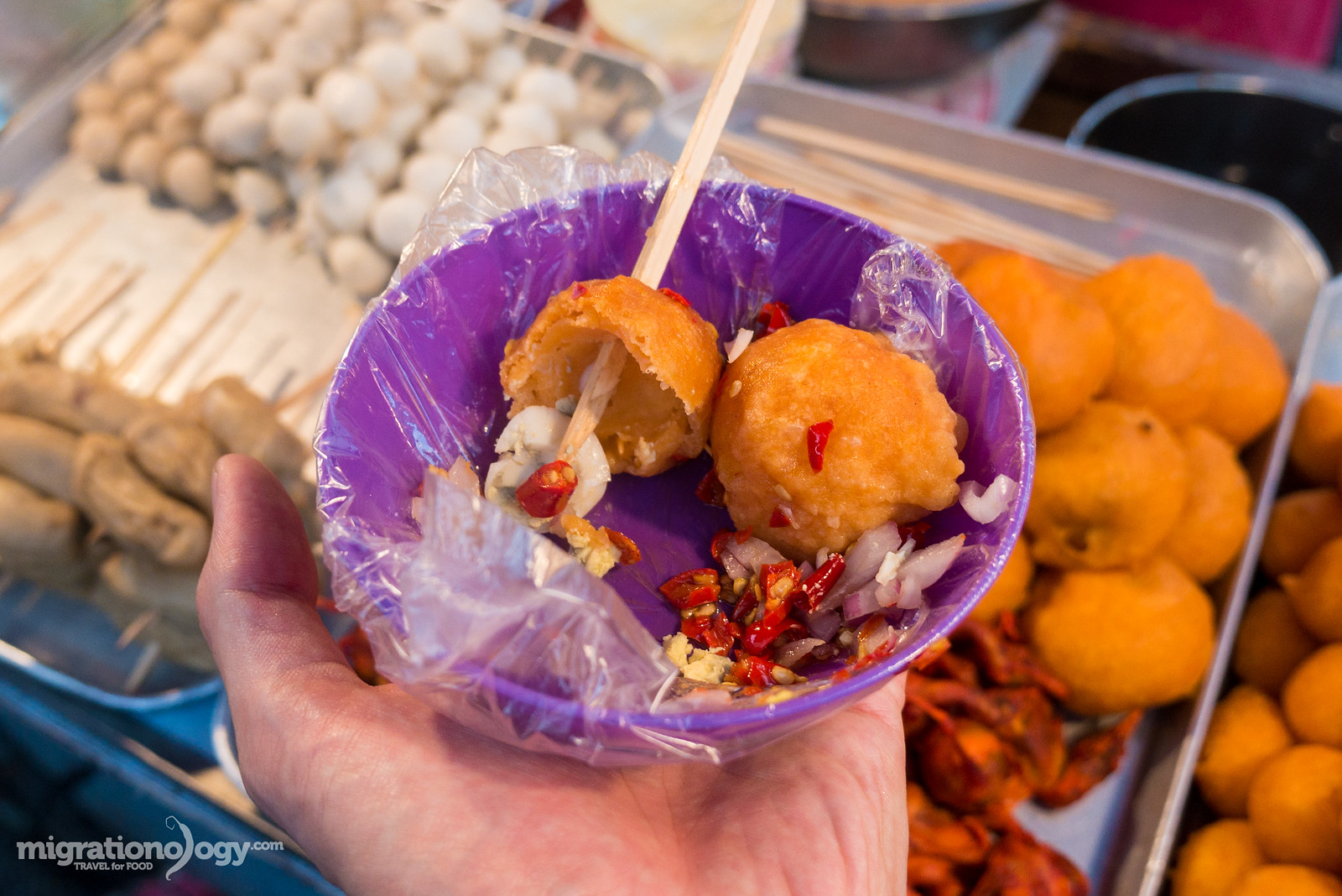 Kwek kwek are quail eggs that are coated in an orange colored batter, and deep fried. You’ll notice them by their bright orange color and almost ping pong ball appearance.